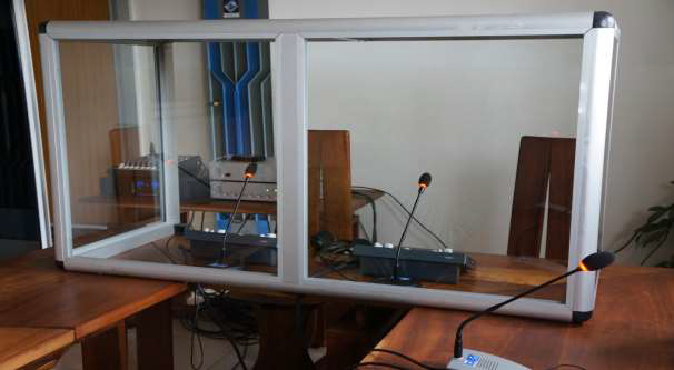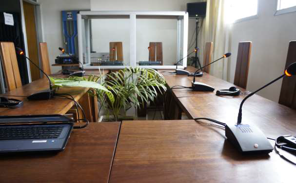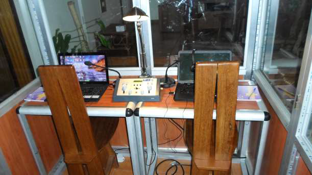 Image of the inside of the booth with microphones, headphones and console units used by our interpreters