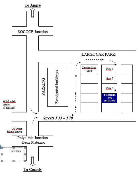 We are located in Deux-plateaux, not far fromBoulevard Latrille, at the intersection of J 33 & J 70 streets, within theSicogi complex, Duplex N°293