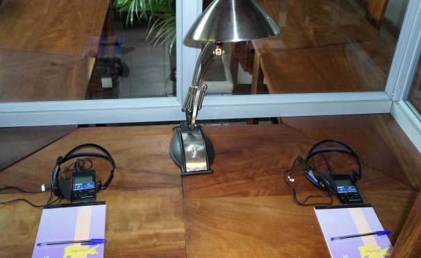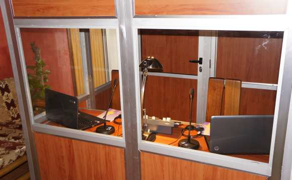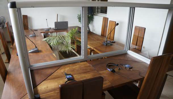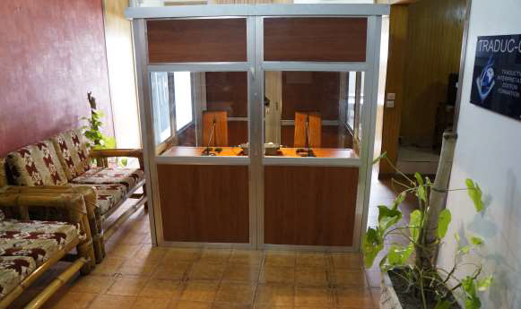 Vue de l’intérieur de la cabine avec les micros, casques et consoles utilisés par les interprètes